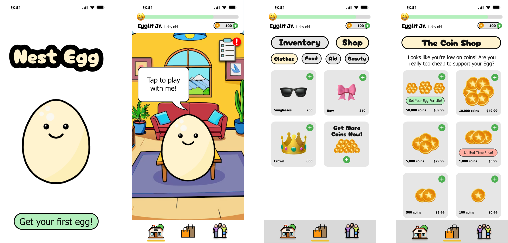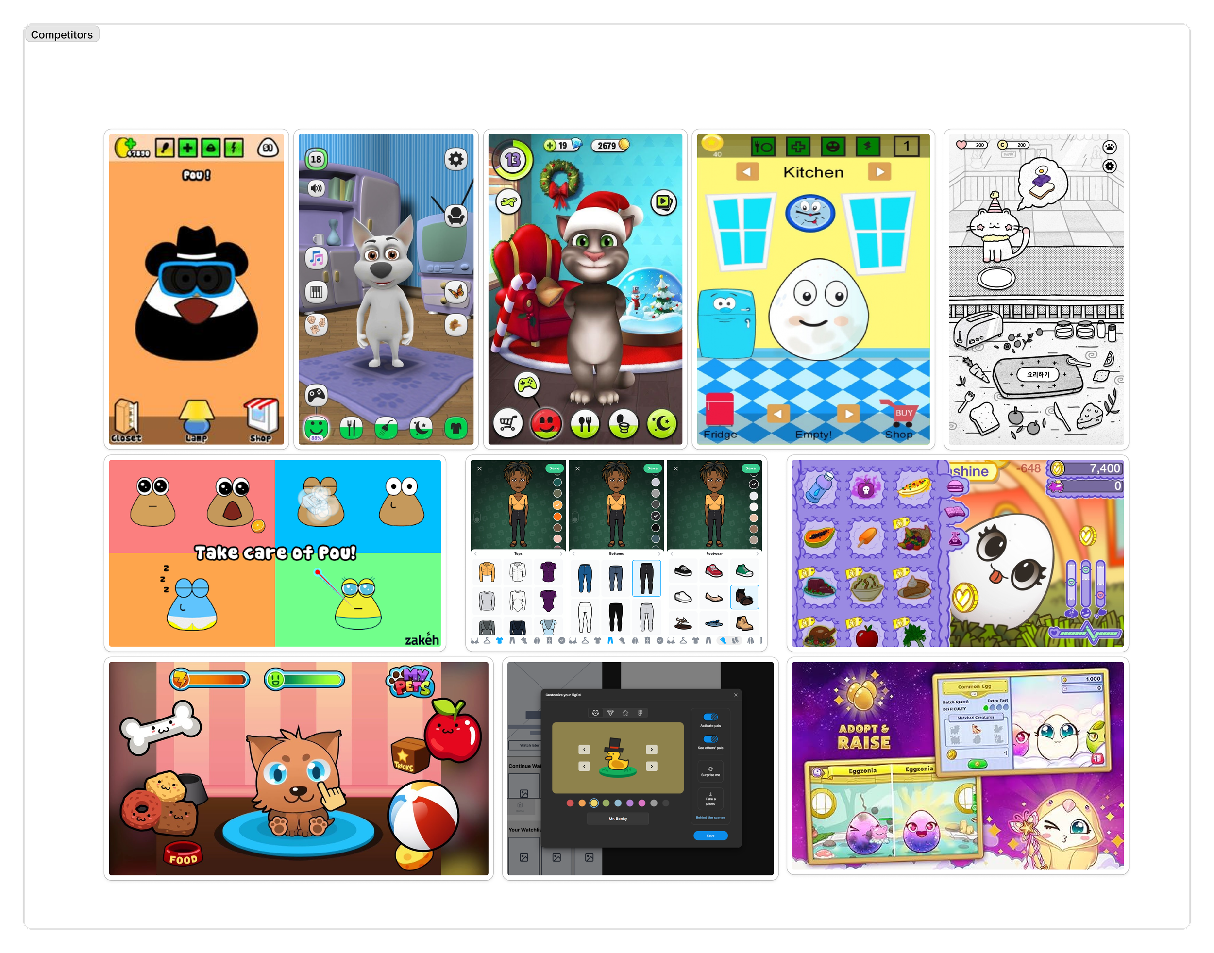 In short, we studied games like My Talking Tom, Pou, and the much-missed Fig-pals from Figma to find our design style. From there, we created a similar game, including micro-transactions, since we realized there was no way to completely remove all dark patterns.